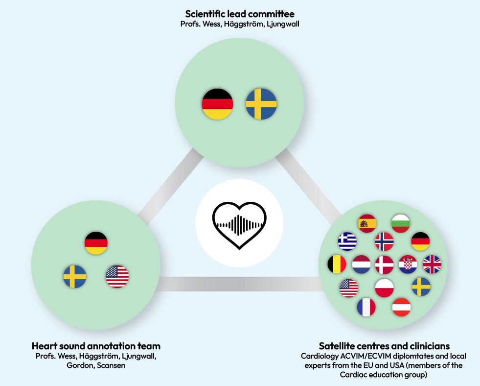 CANINEBEAT® AI was developed by Boehringer Ingelheim and Eko Health, in collaboration with renowned cardiology experts including Prof. Gerhard Wess, Prof. Jens Häggström, and Assoc. Prof. Ingrid Ljungvall. Valuable contributions were also received from Profs. Gordon and Scansen for expert sound annotation and consultancy. In total, almost 50 veterinary cardiologists across the EU and USA were involved, ensuring scientific rigor and clinical relevance.